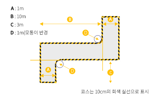 - 시험방법 : 화살표 방향으로 진입하여 진로를 변경하면서 검지선을 접촉하거나, 발이 땅에 닿거나, 라바콘을 접촉하지 않고 통과